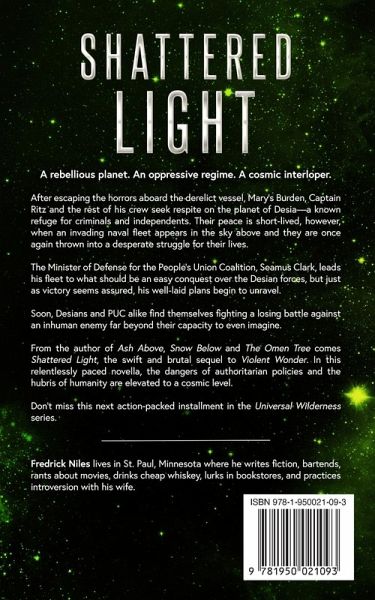 A rebellious planet. An oppressive regime. A cosmic interloper. After escaping the horrors aboard the derelict vessel, Mary's Burden, Captain Ritz and the rest of his crew seek respite on the planet of Desia-a known refuge for criminals and independents. Their peace is short-lived, however, when an invading naval fleet appears in the sky above and they are once again thrown into a desperate struggle for their lives. The Minister of Defense for the People's Union Coalition, Seamus Clark, leads his fleet to what should be an easy conquest over the Desian forces, but just as victory seems assured, his well-laid plans begin to unravel. Soon, Desians and PUC alike find themselves fighting a losing battle against an inhuman enemy far beyond their capacity to even imagine. From the author of Ash Above, Snow Below and The Omen Tree comes Shattered Light, the swift and brutal sequel to Violent Wonder. In this relentlessly paced novella, the dangers of authoritarian policies and the hubris of humanity are elevated to a cosmic level. Don't miss this next action-packed installment in the Universal Wilderness series.