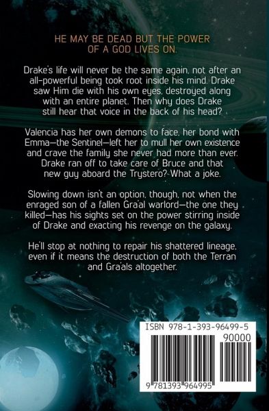 He may be dead but the power of a god lives on. Drake's life will never be the same again, not after an all-powerful being took root inside his mind. Drake saw Him die with his own eyes, destroyed along with an entire planet. Then why does Drake still hear that voice in the back of his head? Valencia has her own demons to face, her bond with Emma-the Sentinel-left her to mull her own existence and crave the family she never had more than ever. Drake ran off to take care of Bruce and that new guy aboard the Trystero? What a joke. Slowing down isn't an option, though, not when the enraged son of a fallen Gra'al warlord-the one they killed-has his sights set on the power stirring inside of Drake and exacting his revenge on the galaxy. He'll stop at nothing to repair his shattered lineage, even if it means the destruction of both the Terran and Gra'als altogether.