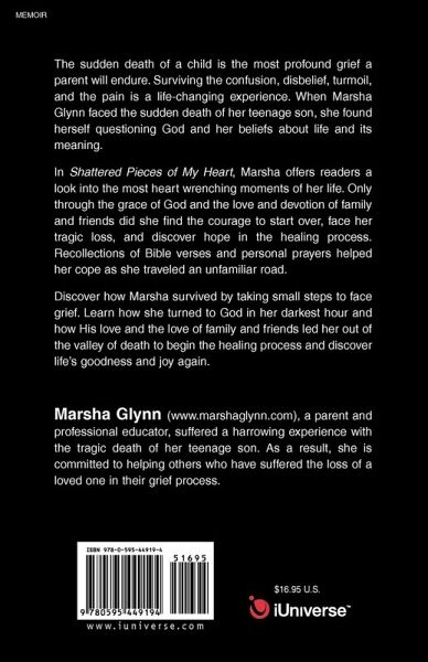 The sudden death of a child is the most profound grief a parent will endure. Surviving the confusion, disbelief, turmoil, and the pain is a life-changing experience. When Marsha Glynn faced the sudden death of her teenage son, she found herself questioning God and her beliefs about life and its meaning. In Shattered Pieces of My Heart, Marsha offers readers a look into the most heart-wrenching moments of her life. Only through the grace of God and the love and devotion of family and friends did she find the courage to start over, face her tragic loss, and discover hope in the healing process. Recollections of Bible verses and personal prayers helped her cope as she traveled an unfamiliar road. Discover how Marsha survived by taking small steps to face grief. Learn how she turned to God in her darkest hour and how his love and the love of family and friends led her out of the valley of death to begin the healing process and discover life's goodness and joy again.