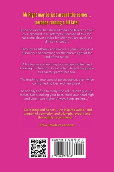 MR RIGHT MAY BE JUST AROUND THE CORNER... PERHAPS RUNNING A BIT LATE! Lynne has loved her share of men and failed as much as succeeded in all attempts. Because of this she has some clever advice for when you are stuck in a difficult situation. Through heartbreak and divorce, Lynne's story is of discovery and searching for the elusive light at the end of the tunnel. A life journey of learning to love beyond fear and knowing the freedom to value her life and happiness as a sacred part of her soul. The inspiring, true story of perseverance, even when confronted by loss and heartbreak. As she says often to many who ask, "Don't give up, ladies. Keep looking your best. Hold your head high and your heart higher. Always keep smiling..."
