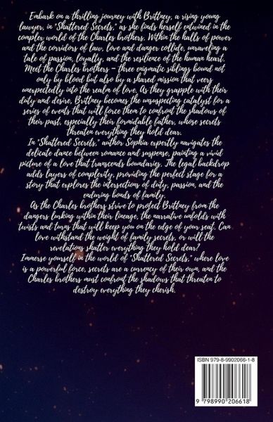 Embark on a thrilling journey with Brittney, a rising young lawyer, in "Shattered Secrets," as she finds herself entwined in the complex world of the Charles brothers. Within the halls of power and the corridors of law, love and danger collide, unraveling a tale of passion, loyalty, and the resilience of the human heart. Meet the Charles brothers - three enigmatic siblings bound not only by blood but also by a shared mission that veers unexpectedly into the realm of love. As they grapple with their duty and desire, Brittney becomes the unsuspecting catalyst for a series of events that will force them to confront the shadows of their past, especially their formidable father, whose secrets pose a threat to everything they hold dear. In "Shattered Secrets," author Sophia expertly navigates the delicate dance between romance and suspense, painting a vivid picture of a love that transcends boundaries. The legal backdrop adds layers of complexity, providing the perfect stage for a story that explores the intersections of duty, passion, and the enduring bonds of family. As the Charles brothers strive to protect Brittney from the dangers lurking within their own lineage, the narrative unfolds with twists and turns that will keep you on the edge of your seat. Can love withstand the weight of family secrets, or will the revelations shatter everything they hold dear? Immerse yourself in the world of "Shattered Secrets," where love is a powerful force, secrets are a currency of their own, and the Charles brothers must confront the shadows that threaten to destroy everything they cherish.