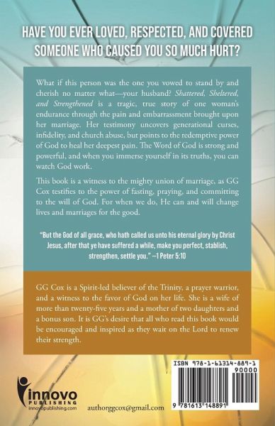 -ABOUT THE BOOK:¿ Shattered, Sheltered, and Strengthened is a tragic, true story of one woman's endurance through the pain and embarrassment brought upon her marriage. Her testimony uncovers generational curses, infidelity, and church abuse, but points to the redemptive power of God to heal her deepest pain. The Word of God is strong and powerful, and when you immerse yourself in its truths, you can watch God work. This book is a witness to the mighty union of marriage, as GG Cox testifies to the power of fasting, praying, and committing to the will of God. For when we do, He can and will change lives and marriages for the good. -ABOUT THE AUTHOR: ¿¿GG Cox is a Spirit-led believer of the Trinity, a prayer warrior, and a witness to the favor of God on her life. She is a wife of more than twenty-five years and a mother of two daughters and a bonus son. It is GG's desire that all who read this book would be encouraged and inspired as they wait on the Lord to renew their strength. -ABOUT THE PUBLISHER: Innovo Publishing LLC is a Christ-centered publisher located near Memphis, TN. Since 2008, Innovo has been publishing quality books, eBooks, audiobooks, music, screenplays, and online and physical curricula that support the Great Commission, equip believers, and help create a positive Christian worldview. Innovo's capabilities and global reach provide Christian authors, artists, and ministries access to the world for Christ. To learn more about Innovo Publishing, visit our website at innovopublishing.com. To connect with other Christian creatives and to learn best practices for creating, publishing, marketing, and selling Christian titles, visit the Christian Publishing Portal at cpportal.com.