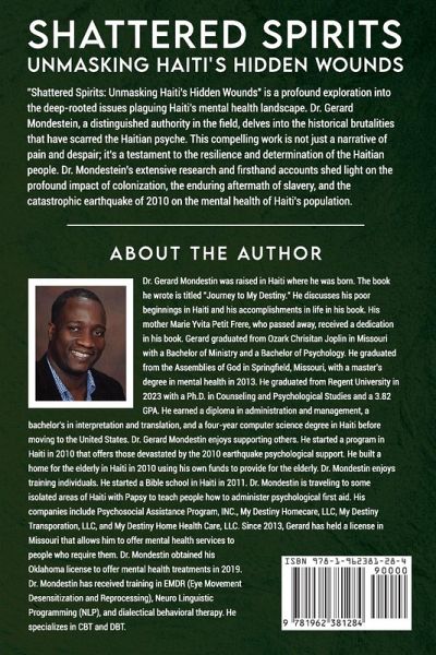 "Shattered Spirits: Unmasking Haiti's Hidden Wounds" is a profound exploration into the deep-rooted issues plaguing Haiti's mental health landscape. Dr. Gerard Mondestein, a distinguished authority in the field, delves into the historical brutalities that have scarred the Haitian psyche. This compelling work is not just a narrative of pain and despair; it's a testament to the resilience and determination of the Haitian people. Dr. Mondestein's extensive research and firsthand accounts shed light on the profound impact of colonization, the enduring aftermath of slavery, and the catastrophic earthquake of 2010 on the mental health of Haiti's population.