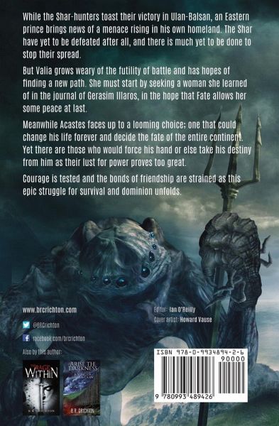While the Shar-hunters toast their victory in Ulan-Balsan, an Eastern prince brings news of a menace rising in his own homeland. The Shar have yet to be defeated after all, and there is much yet to be done to stop their spread. But Valia grows weary of the futility of battle and has hopes of finding a new path. She must start by seeking a woman she learned of in the journal of Gerasim Illaros, in the hope that Fate allows her some peace at last. Meanwhile Acastes faces up to a looming choice; one that could change his life forever and decide the fate of the entire continent. Yet there are those who would force his hand or else take his destiny from him as the lust for power proves too great for some. Courage is tested and the bonds of friendship are strained as this epic struggle for survival and power unfolds.