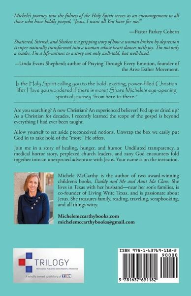 Michele's journey into the fulness of the Holy Spirit serves as an encouragement to all those who have boldly prayed, "Jesus, I want all You have for me!" -Pastor Parkey Cobern Shattered, Stirred, and Shaken is a gripping story of how a woman broken by depression is super naturally transformed into a woman whose heart dances with joy. I'm not only a reader, I'm a life-witness to a story not only well-told, but well-lived. -Linda Evans Shepherd; author of Praying Through Every Emotion, founder of the Arise Esther Movement. Is the Holy Spirit calling you to the bold, exciting, power-filled Christian life? Have you wondered if there is more? Share Michele's eye-opening spiritual journey "from here to there." Are you searching? A new Christian? An experienced believer? Fed up or dried up? As a Christian for decades, I recently learned the scope of the gospel is beyond everything I had ever been taught. Allow yourself to set aside preconceived notions. Unwrap the box we easily put God in to take hold of the "more" He offers. Join me in a story of healing, hunger, and humor. Undiluted transparency, a medical horror story, perplexed church leaders, and zany God encounters fold together into an unexpected adventure with Jesus. Your name is on the invitation.