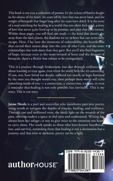 Jaime Nicole is a poet and storyteller who transforms pain into poetry, using words to navigate the depths of trauma, healing, and resilience. Through raw and unfiltered verse, she sheds light on the wounds of the past, offering readers a space to feel seen and understood. Writing has always been her refuge-a way to give voice to the emotions too heavy to carry alone. Her work speaks to those who have known heartbreak, loss, and survival, reminding them that healing is not a destination but a journey, and that even in darkness, poetry can be a light.