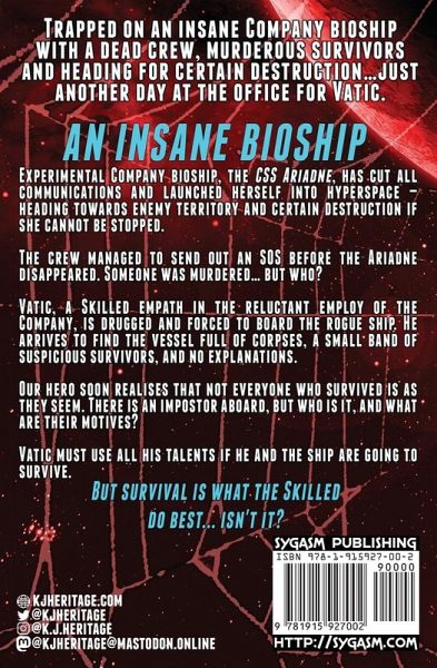 Vatic, a top Company empath, is forced to board a rogue bioship heading for certain destruction. Experimental Company bioship, the CSS Ariadne, has cut all communications and launched herself into hyperspace-heading towards enemy territory and certain destruction if she cannot be stopped. The crew managed to send out an SOS before the Ariadne disappeared. Someone was murdered... but who? Vatic, a Skilled empath in the reluctant employ of the Company, is drugged and forced to board the rogue ship. He arrives to find the vessel full of corpses, a small band of suspicious survivors, and no explanations. Our hero soon realises that not everyone who survived is as they seem. There is an imposter aboard, but who is it, and what are their motives? Vatic must use all his talents if he and the ship are going to survive. But survival is what the Skilled do best... isn't it?