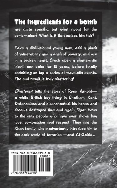 The ingredients for a bomb are quite specific, but what about for the bomb-maker? What is it that makes him tick? Take a disillusioned young man, add a pinch of vulnerability and a dash of poverty, and mix in a broken heart. Crack open a charismatic 'devil' and bake for 18 years, before finally sprinkling on top a series of traumatic events. The end result is truly shattering! Shattered tells the story of Ryan Arnold-a white British boy living in Chatham, Kent. Defenceless and disenchanted, his hopes and dreams destroyed time and again, Ryan turns to the only people who have ever shown him love, compassion and respect. They are the Khan family, who inadvertently introduce him to the dark world of terrorism-and Al-Qaida...