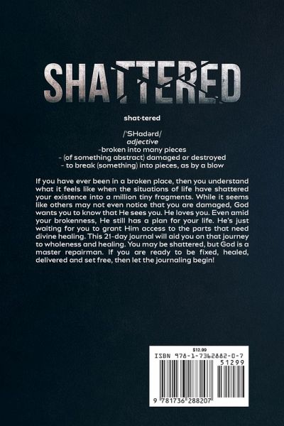 shat·tered /¿SHad¿rd/ adjective -broken into many pieces - (of something abstract) damaged or destroyed -to break (something) into pieces, as by a blow If you have ever been in a broken place, then you understand what it feels like when the situations of life have shattered your existence into a million tiny fragments. While it seems like others may not even notice that you are damaged, God wants you to know that He sees you. He loves you. Even amid your brokenness, He still has a plan for your life. He's just waiting for you to grant Him access to the parts that need divine healing. This 21-day journal will aid you on that journey to wholeness and healing. You may be shattered, but God is a master repairman. If you are ready to be fixed, healed, delivered and set free, then let the journaling begin!