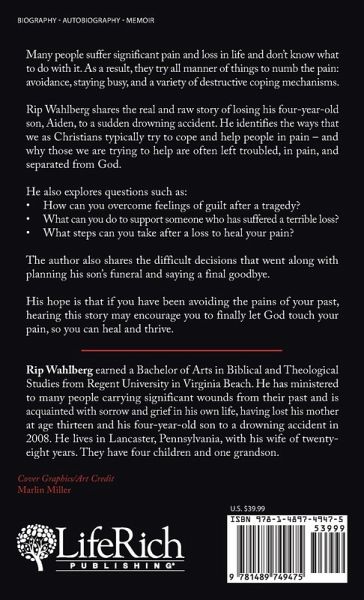 Many people suffer significant pain and loss in life and don't know what to do with it. As a result, they try all manner of things to numb the pain: avoidance, staying busy, and a variety of destructive coping mechanisms. Rip Wahlberg shares the real and raw story of losing his four-year-old son, Aiden, to a sudden drowning accident. He identifies the ways that we as Christians typically try to cope and help people in pain - and why those we are trying to help are often left troubled, in pain, and separated from God. He also explores questions such as: ¿ How can you overcome feelings of guilt after a tragedy? ¿ What can you do to support someone who has suffered a terrible loss? ¿ What steps can you take after a loss to heal your pain? The author also shares the difficult decisions that went along with planning his son's funeral and saying a final goodbye. His hope is that if you have been avoiding the pains of your past, hearing this story may encourage you to finally let God touch your pain, so you can heal and thrive.