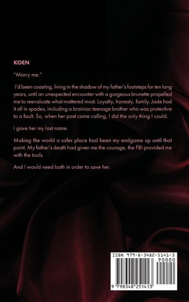 Koen "Marry me." I'd been coasting, living in the shadow of my father's footsteps for ten long years, until an unexpected encounter with a gorgeous brunette propelled me to reevaluate what mattered most. Loyalty, honesty, family. Jade had it all in spades, including a brainiac teenage brother who was protective to a fault. So, when her past came calling, I did the only thing I could. I gave her my last name. Making the world a safer place had been my endgame up until that point. My father's death had given me the courage, the FBI provided me with the tools. And I would need both in order to save her.