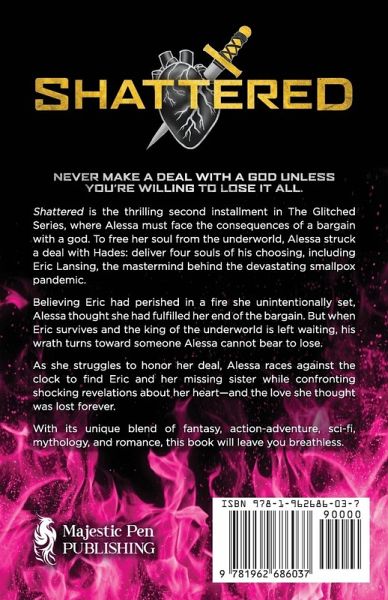 NEVER MAKE A DEAL WITH A GOD UNLESS YOU'RE WILLING TO LOSE IT ALL. Shattered is the thrilling second installment in The Glitched Series, where Alessa must face the consequences of a bargain with a god. To free her soul from the underworld, Alessa struck a deal with Hades: deliver four souls of his choosing, including Eric Lansing, the mastermind behind the devastating smallpox pandemic. Believing Eric had perished in a fire she unintentionally set, Alessa thought she had fulfilled her end of the bargain. But when Eric survives and the king of the underworld is left waiting, his wrath turns toward someone Alessa cannot bear to lose. As she struggles to honor her deal, Alessa races against the clock to find Eric and her missing sister while confronting shocking revelations about her heart-and the love she thought was lost forever. With its unique blend of fantasy, action-adventure, scifi, mythology, and suspense romance, this book will leave you breathless. If you enjoy fantasy romance books, buy Shattered today and join the romance fantasy world of Spartans!