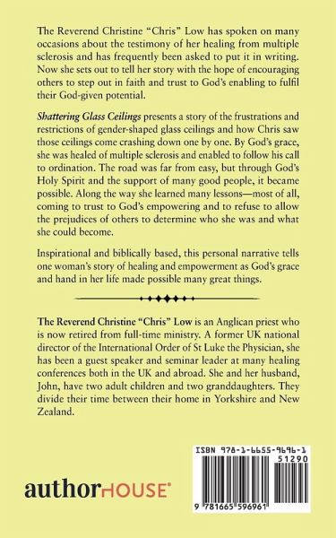 The Reverend Christine "Chris" Low has spoken on many occasions about the testimony of her healing from multiple sclerosis and has frequently been asked to put it in writing. Now she sets out to tell her story with the hope of encouraging others to step out in faith and trust to God's enabling to fulfill their God-given potential. Shattering Glass Ceilings presents a story of the frustrations and restrictions of gender-shaped glass ceilings and how Chris saw those ceilings come crashing down one by one. By God's grace, she was healed of multiple sclerosis and enabled to follow his call to ordination. The road was far from easy, but through God's Holy Spirit and the support of many good people, it became possible. Along the way she learned many lessons-most of all, coming to trust to God's empowering and to refuse to allow the prejudices of others to determine who she was and what she could become. Inspirational and biblically based, this personal narrative tells one woman's story of healing and empowerment as God's grace and hand in her life made possible many great things.