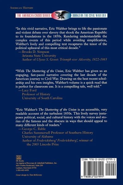 Eric Walther's The Shattering of the Union is an accessible, very readable account of the turbulent 1850s. This lively survey juxtaposes political, social, and cultural history with the voices and stories of the famous and the obscure in ways that should appeal to many different kinds of readers. -- George C. Rable, University of Alabama, author of Fredericksburg! Fredericksburg! In this vivid narrative, Eric Walther brings to life the passionate and violent debate over slavery that shook the American Republic to its foundations in the 1850s. Rendering understandable the complex events of this period whie avoiding simplification, Walther's lively and compelling text recaptures the tenor of the political upheaval of this most critical decade. -- Brooks D. Simpson, Arizona State University, author of Ulysses S. Grant With The Shattering of the Union, Eric Walther has given us an engaging, fast-paced narrative covering the last decade of the American journey to Civil War. Drawing on the best recent scholarship and his own insights, Walther's volume is a quick read that is perfect for classroom use. It is a compelling tale, well told. -- Lacy Ford, University of South Carolina Walther's narrative and analysis of the growing sectional crisis of the 1850s is a masterful blend of the general and particular, and although the events in the book are familiar, Walther's telling of the story is fresh, insightful, and cogent. This is a major contribution to the history and historiography of the coming of the Civil War. Highly recommended. All levels and collections. CHOICE