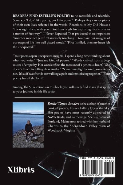 Readers find Estelle's poetry to be accessible and relatable. Some say "I don't like poetry, but I like yours." Perhaps they can see pieces of their own lives reflected in the words. Reactions to My Old House : "I was right there with you...You have a gift for capturing life's truths in a matter of fact way." I Never Expected That produced these responses: "Another succinct gem." "Extremely touching...You have put nuggets of our stages of life into well placed words." "First I smiled, then my heart felt the unexpected." "Your poems open unexpected insights. I spend a long time thinking about what you write." "Just my kind of poems." "Words crafted from a deep source of empathy. Her words reflect the measure of a generous heart" "She doesn't flinch in telling clear truths." "Sometimes lighthearted, sometimes not. It's as if two friends are walking a path and reminiscing together." "Your poetry has all the feels!" Among The 50 selections in this book, you will surely find many that speak to your journey in this life so far.