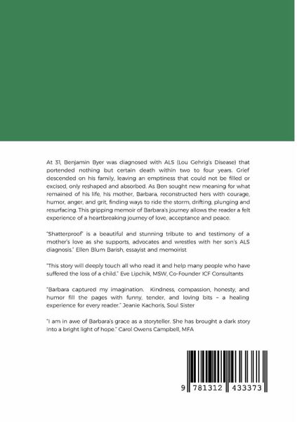 At 31, Benjamin Byer was diagnosed with ALS (Lou Gehrig's Disease) that portended nothing but certain death within two to four years. Grief descended on his family, leaving an emptiness that could not be filled or excised, only reshaped and absorbed. As Ben sought new meaning for what remained of his life, his mother, Barbara, reconstructed hers with courage, humor, anger, and grit, finding ways to ride the storm, drifting, plunging and resurfacing. This gripping memoir of Barbara's journey allows the reader a felt experience of a heartbreaking journey of love, acceptance and peace.