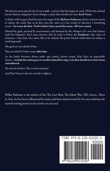 The sky was never just the sky. It was a seal-a prison that has begun to crack. When the celestial barrier shatters, forgotten voices whisper a name that should not exist: Kael Veyne. A drifter with no past, Kael becomes the target of the Skyborn Enforcers, divine warriors sworn to silence the truth. But as he flees into the ruins of a lost world, he discovers a horrifying secret-he is not the first. Twelve before him carried his name. All were erased. Hunted by gods, pursued by executioners, and haunted by the whispers of a war that history itself has forgotten, Kael must uncover who he truly is before the Pantheon-the rulers of existence-erase him once more. But as he unlocks the power buried within him, he realizes a terrifying truth: The gods are not afraid of him. They are afraid of what comes after him. As the battle between divine order and cosmic horror erupts, Kael faces an impossible choice-reclaim his stolen past or sacrifice himself to stop a war that should never have been remembered. The sky has broken. The war has returned. And Kael Veyne is the last one left to fight it.