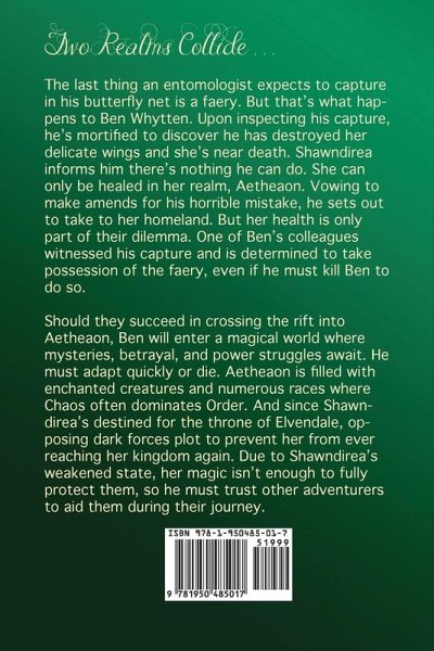 Often the smallest unexpected surprises garner the most demanding dilemmas, which proves to be the ordeal that entomologist Ben Whytten faces. While netting butterflies to add to his vast collection, he mistakenly sweeps the most spectacular butterfly he has ever seen into his net. Upon examining his catch, Ben is horrified to discover he has captured a faery and shredded her delicate wings into useless ribbons. Devastated, Ben vows to take Shawndirea back to her realm, Aetheaon; but he discovers the journey places their lives into immediate danger. To get to Aetheaon, they must pass through a portal rift deep inside a cave called Devils Den, which is known to be haunted. Once they cross the rift, Ben enters a world where mysteries, magic, betrayal, and power struggles await. He must adapt quickly or die because Aetheaon is filled with enchanted creatures and numerous races where chaos often dominates order. And since Shawndirea's destined for the throne of Elvendale, opposing dark forces plot to prevent her from ever reaching her kingdom again. The faery's magic isn't enough to fully protect them, so he must place his trust in other adventurers to aid them during their journey.