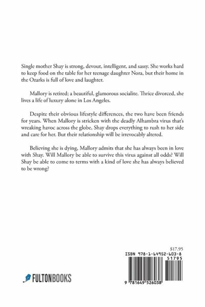 Single mother Shay is strong, devout, intelligent, and sassy. She works hard to keep food on the table for her teenage daughter Nora, but their home in the Ozarks is full of love and laughter. Mallory is retired; a beautiful, glamorous socialite. Thrice divorced, she lives a life of luxury alone in Los Angeles. Despite their obvious lifestyle differences, the two have been friends for years. When Mallory is stricken with the deadly Alhambra virus thats wreaking havoc across the globe, Shay drops everything to rush to her side and care for her. But their relationship will be irrevocably altered. Believing she is dying, Mallory admits that she has always been in love with Shay. Will Mallory be able to survive this virus against all odds? Will Shay be able to come to terms with a kind of love she has always believed to be wrong?