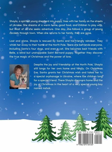 "Shayla's Adventure: Home for Christmas" Shayla, a spirited young shepherd mix puppy, lives with her family on the streets of Ukraine. She dreams of a warm home, good food, and children to play with, but most of all she seeks adventure. One day, she follows a group of young carolers through town. When she returns to her family, they are gone. Lost and alone, Shayla is rescued by Santa and his friendly reindeer. They take her home with them to the North Pole. There she befriends everyone, including Santa's four dogs, and even a cat. She becomes best friends with Belle, a blind but unstoppable…mehr