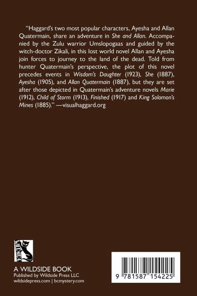"Haggard's two most popular characters, Ayesha and Allan Quatermain, share an adventure in She and Allan. Accompanied by the Zulu warrior Umslopogaas and guided by the witch-doctor Zikali, in this lost world novel Allan and Ayesha join forces to journey to the land of the dead. Told from hunter Quatermain's perspective, the plot of this novel precedes events in Wisdom's Daughter (1923), She (1887), Ayesha (1905), and Allan Quatermain (1887), but they are set after those depicted in Quatermain's adventure novels Marie (1912), Child of Storm (1913), Finished (1917) and King Solomon's Mines (1885)." --visualhaggard.org