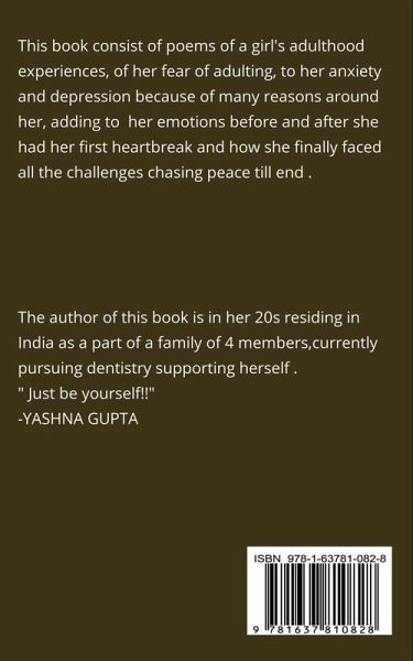 This book consist of poems of a girl's adulthood experiences, of her fear of adulting, to her anxiety and depression because of many reasons around her, adding to she expressing her emotions before and after she had her first heartbreak and how she finally faced all the challenges chasing peace till end .