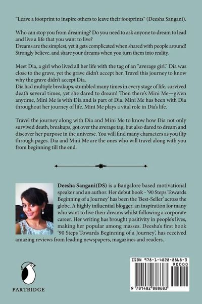 "Leave a footprint to inspire others to leave their footprints" (Deesha Sangani). Who can stop you from dreaming? Do you need to ask anyone to dream to lead and live a life that you want to live? Dreams are the simplest, yet it gets complicated when shared with people around! Strongly believe, and share your dreams when you turn them into reality. Meet Dia, a girl who lived all her life with the tag of an "average girl." Dia was close to the grave, yet the grave didn't accept her. Travel this journey to know why the grave didn't accept Dia. Dia had multiple breakups, stumbled many times in every stage of life, survived death several times, yet she dared to dream! Then there's Mini Me-given anytime, Mini Me is with Dia and is part of Dia. Mini Me has been with Dia throughout her journey of life. Mini Me plays a vital role in Dia's life. Travel the journey along with Dia and Mini Me to know how Dia not only survived death, breakups, got over the average tag, but also dared to dream and discover her purpose in the universe. You will find many characters as you flip through pages. Dia and Mini Me are the ones who will travel along with you from beginning till the end.