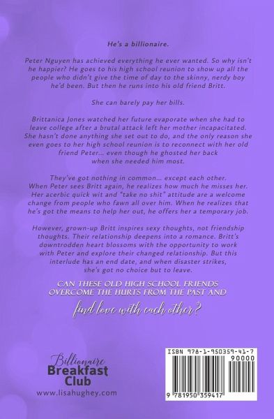He's a billionaire. Peter Nguy¿n has achieved everything he ever wanted. So why isn't he happier? He goes to his high school reunion to show up all the people who didn't give the time of day to the skinny, nerdy boy he'd been. But then he runs into his old friend Britt.She can barely pay her bills..Brittanica Jones watched her future evaporate when she had to leave college after a brutal attack left her mother incapacitated. She hasn't done anything she set out to do, and the only reason she even goes to her high school reunion is to reconnect with her old friend Peter... even though he ghosted her back when she needed him most.They've nothing in common... except each other.When Peter sees Britt again, he realizes how much he misses her. Her acerbic quick with and "take no shit" attitude are a welcome change from the people who fawn all over him. When he realizes that he's got the means to help her out, he offers a temporary job.However, grown-up Britt inspires sexy thoughts, not friendship thoughts. Their relationship deepens into a romance. Britt's downtrodden heart blossoms with the opportunity to work with Peter and explore their changed relationship. But this interlude has an end date, and when disaster strikes, she's got no choice but to leave. CAN THESE OLD HIGH SCHOOL FRIENDS OVERCOME THE HURTS FROM THE PAST ANDFIND LOVE WITH EACH OTHER?