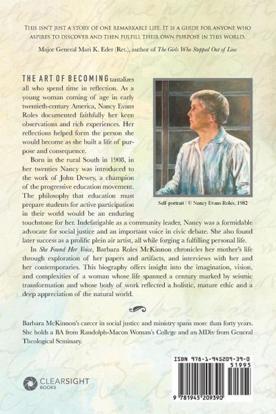 THE ART OF BECOMING tantalizes all who spend time in reflection. As a young woman coming of age in early twentieth-century America, Nancy Evans Roles documented faithfully her keen observations and rich experiences. Her reflections helped form the person she would become as she built a life of purpose and consequence. Born in the rural South in 1908, in her twenties Nancy was introduced to the work of John Dewey, a champion of the progressive education movement. The philosophy that education must prepare students for active participation in their world would be an enduring touchstone for her. Indefatigable as a community leader, Nancy was a formidable advocate for social justice and an important voice in civic debate. She also found later success as a prolific plein air artist, all while forging a fulfilling personal life. In She Found Her Voice, Barbara Roles McKinnon chronicles her mother's life through exploration of her papers and artifacts, and interviews with her and her contemporaries. This biography offers insight into the imagination, vision, and complexities of a woman whose life spanned a century marked by seismic transformation and whose body of work reflected a holistic, mature ethic and a deep appreciation of the natural world.