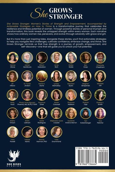Welcome to She Grows Stronger: Women's Stories of Strength and Empowerment, Accompanied by Actionable Strategies on How to Thrive, a powerful and transformative book that celebrates the resilience, strength, and limitless potential of women everywhere. In this inspiring collection, you'll discover the stories of extraordinary women who, despite facing adversity, found the courage to rise, evolve, and thrive. These are not just tales of hardship-they are profound testimonies of the untapped power that lies within every woman, waiting to be awakened. Through each chapter, you'll be inspired by women who have confronted life's toughest challenges with grace, grit, and determination. Their journeys are a testament to the transformative power of embracing struggle as a stepping stone toward growth. As you read, you'll see that strength isn't defined by the absence of obstacles, but by the resilience to face them and emerge stronger. But She Grows Stronger is more than just a collection of stories-it's a practical guide to empowerment. Interwoven with these moving narratives are actionable strategies designed to help you navigate life's ups and downs with confidence. Whether you're looking to cultivate unshakeable self-esteem, embrace change, or handle setbacks with poise, this book offers real-world tools to help you thrive. Each story and strategy within these pages will inspire you to recognize your inner power, trust your journey, and take bold steps toward your own transformation. She Grows Stronger reminds us that empowerment is not a destination, but a lifelong process of growth, self-discovery, and rising to meet each new challenge. No matter where you are on your path, this book will be your companion-encouraging you to rise, embrace your strength, and remember: you have the power to grow stronger, no matter the obstacles you face. Join Hanna Olivas and 31 inspiring authors in She Grows Stronger: Women's Stories of Strength and Empowerment, Accompanied by Actionable Strategies on How to Thrive:Adrian Gentilcore Allison Gabaldon Amie Rich Bailey Waite Bec Koop Charissa Lauren Charlotte Cheetham Debra Hillard Dr. Farah Jindani Kerrie D. Stone Lynsey Mahoskey Maureen Byers Meghan Skrepenski Michelle Gill Molly Hurd Phuoc Anne Nguyen, PharmD, MS, BCPS, FTSHP Roxanne Dinel Sarah Carswell Shannon Addison Shanon Opp Sheena L. Smith Sherry Vinson Shirin Lakhani Stéphane-Laure Caubet Suzanne Andora Barron Teri Katzenberger Tina Fletcher Traci Powell Valarie Harris Wendy Harmon Yulia Drummond