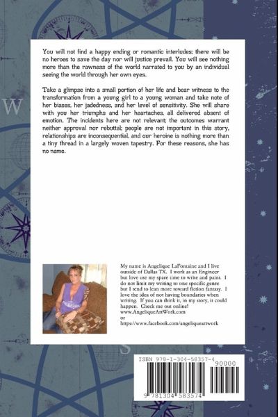 You will not find a happy ending or romantic interludes; there will be no heroes to save the day nor will justice prevail. You will see nothing more than the rawness of the world narrated to you by an individual seeing the world through her own eyes. Take a glimpse into a small portion of her life and bear witness to the transformation from a young girl to a young woman and take note of her biases, her jadedness, and her level of sensitivity. She will share with you her triumphs and her heart aches, all delivered absent of emotion. The incidents here are not relevant; the outcomes warrant neither approval nor rebuttal; people are not important in this story, relationships are inconsequential, and our heroine is nothing more than a tiny thread in a largely woven tapestry. For these reasons, she has no name.