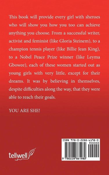 This book will provide every girl with s-heroes who will show you how you too can achieve anything you choose. From a successful writer and author (like Gloria Steinem), to a champion tennis player (like Billie Jean King), to a Nobel Peace Prize winner (like Leyma Gbowee), each of these women started out as young girls with very little, except for their dreams. It was by believing in themselves, despite difficulties in their way, that they were able to reach their goals. YOU ARE SHE!