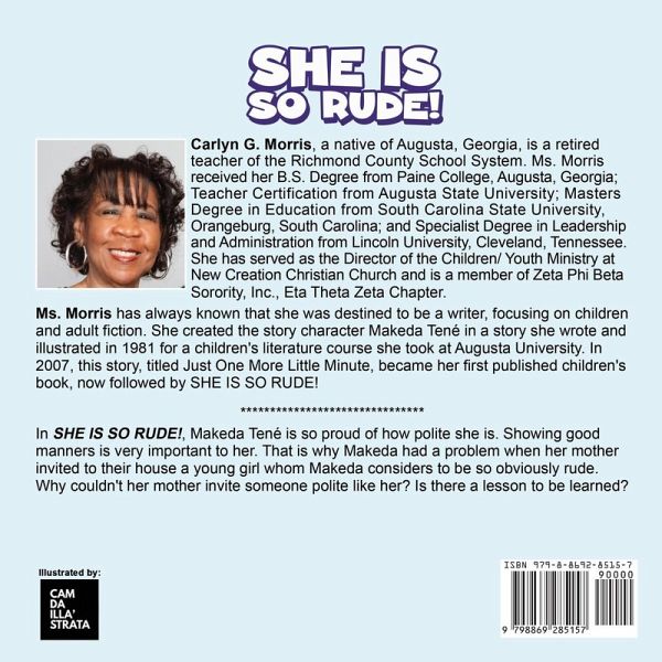 Carlyn G. Morris, a native of Augusta, Georgia, is a retired teacher of the Richmond County School System. Ms. Morris received her B.S. Degree from Paine College, Augusta, Georgia; Teacher Certification from Augusta State University; Masters Degree in Education from South Carolina State University, Orangeburg, South Carolina; and Specialist Degree in Leadership and Administration from Lincoln University, Cleveland, Tennessee. She has served as the Director of the Children/ Youth Ministry at New Creation Christian Church and is a member of Zeta Phi Beta Sorority, Inc., Eta Theta Zeta Chapter. Ms. Morris has always known that she was destined to be a writer, focusing on children and adult fiction. She created the story character Makeda Tene in a story she wrote and illustrated in 1981 for a children's literature course she took at Augusta University. In 2007, this story, titled just One more Little Minute, became her first published children's book, now followed by SHE IS SO RUDE! In SHE IS SO RUDE!, Makeda Tene is so proud of how polite she is. Showing good manners is very important to her. That is why Makeda had a problem when her mother invited to their house a young girl whom Makeda considers to be so obviously rude. Why couldn't her mother invite someone polite like her? Is there a lesson to be learned?