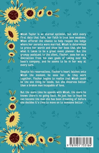 Micah Taylor is an eternal optimist, but with every first date that fails, her faith in true love weakens. When offered the chance to help reopen the lodge where her parents were married, Micah is determined to prove her worth and show her boss that she has what it takes to be a great event planner. But the grumpy assistant to the client, Fischer, sees her as a distraction from his own goals of taking over his boss's company, and he seems to be in her way at every turn. Despite his reservations, Fischer's heart latches onto Micah the moment he sees her. As they work together, Fischer begins to realize that Micah could be the one thing he needs, but she deserves better than a broken man incapable of love. But the more time he spends with Micah, the more he knows there's no going back. He just has to hope he can become the man she has been dreaming of before she decides it's time to move on to someone better. Books in the Love in Sun City series are tied together and overlap but can be read in any order or as standalones. They contain minimal to no swearing and no explicit content.