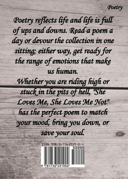 Poetry reflects life, and life is full of ups and downs. Read a poem a day or devour the collection in one sitting; either way, Siders captures the range of emotions that make us human. Whether you are riding high or stuck in the pits of hell, She Loves Me, She Loves Me Not has the perfect poem to match your mood, bring you down, or save your soul.