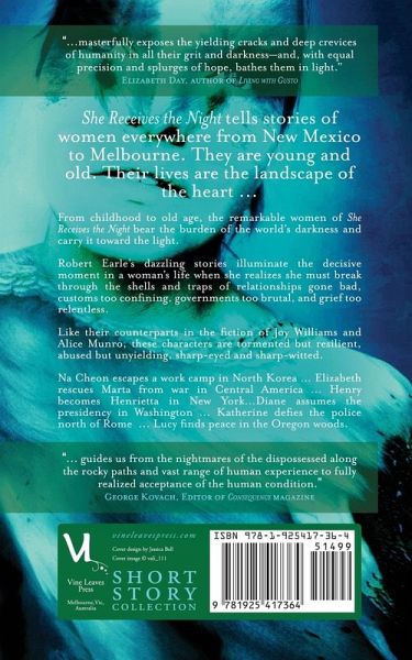 From childhood to old age, the remarkable women of She Receives the Night bear the burden of the world’s darkness and carry it toward the light. Robert Earle’s dazzling stories illuminate the decisive moment in a woman’s life when she realizes she must break through the shells and traps of relationships gone bad, customs too confining, governments too brutal, and grief too relentless. Like their counterparts in the fiction of Joy Williams and Alice Munro, these characters are tormented but resilient, abused but unyielding, sharp-eyed and sharp-witted. Na Cheon escapes a work camp in North Korea … Elizabeth rescues Marta from war in Central America … Henry becomes Henrietta in New York … Diane assumes the presidency in Washington … Katherine defies the police north of Rome … Lucy finds peace in the Oregon woods. She Receives the Night tells stories of women everywhere from New Mexico to Melbourne. They are young and old. Their lives are the landscape of the heart.