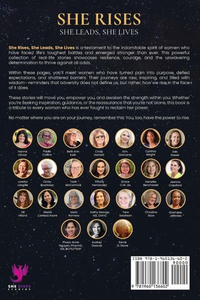 In She Rises, She Leads, She Lives, you'll discover the powerful, transformative stories of women who have faced life's toughest challenges and emerged not just unbroken-but triumphant. This isn't a book of mere victories; it's a celebration of the resilience, courage, and unwavering strength that reside in every woman, regardless of her path. Each story in this collection is an intimate portrait of women who have confronted adversity with incredible determination. From personal loss and heartbreak to defying societal expectations and overcoming seemingly insurmountable obstacles, these women's journeys are a testament to the power of the human spirit. They didn't just survive-they thrived. In these pages, you'll find more than just stories of struggle-you'll discover wisdom, transformation, and empowerment. These women offer you more than inspiration; they offer real-life lessons on resilience, resourcefulness, and the courage to rise in the face of fear and pain. Their stories will ignite your own inner strength and remind you that, no matter the odds, you too can rise, lead, and live. Whether you're facing personal hardship, navigating societal barriers, or seeking your own path to strength and empowerment, She Rises, She Leads, She Lives is a tribute to every woman who has ever overcome adversity with grace, grit, and heart. This book is for every woman who is still rising, still leading, and still living-no matter what challenges lie ahead. Are you ready to rise? Join Hanna Olivas and 23 inspiring authors in She Rises, She Leads, She Lives: Overcoming Obstacles and Thriving Against All Odds:Paula Collins Beth Ann Kaib Cindy Hartzell Kim Diamond Cynthia Height Erin Roese Loretta Langille Cindy Brockway Tash McCormick Tiffany Hernandez Grace C.W. Liu Danette Bencharski Jeanna Crawford Debra Hillard Sheila Certeza Asare Idaliz Romero Kathy George, MS, CMHC Tara Swanson Christine Stow Dashana Jefferies Phuoc Anne Nguyen, PharmD, MS, BCPS, FTSHP Audrey Dworak Kerrie D. Stone