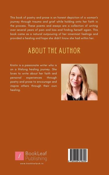 This book of poetry and prose is an honest depiction of a woman's journey through trauma and grief while holding onto her faith in the process. These poems and essays are a collection of writing over several years of pain and loss and finding herself again. This book came as a natural outpouring of her innermost feelings and provided a healing and hope she didn't know she had within her.
