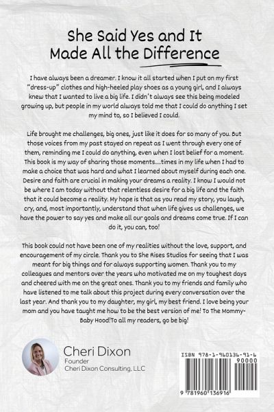 She Said Yes, and It Made All the Difference is written for anyone who wants to give yourself permission to take a chance, say yes when presented with hard choices, and build a life you love. This book lets you explore empowerment on a personal level. It is the author's journey through life, when she had to make a choice, even when fear presented itself, and what she learned about herself along the way. The book's contents are deeply rooted in circumstances that put the author into challenging decisions and, in return, rendered key takeaways. As you read the book, you will be able to harness the following: Knowing that your childhood does not define you as an adult.Understanding that fear will hold you back, but you can still move forward even when afraid. Develop resiliency and build a life that aligns with your core values. How to be a strong female role model to everyone in your inner circle. All chapters were authentically written and represent the author's experiences that show the resolve to build a big life, even in the face of challenges and adversities. It renders how believing in yourself serves as steppingstones to getting a life you want to wake up to each day. You will learn:How to quiet the voice of fear. How to listen to the inner cheerleader when pushing you to pursue your goals and dreams. Overcoming your thoughts when they tell you that you can't make your goals reality. Understanding of the influence that a female leader has on others. Realize that actions from others do not define us. Join the author on her path of saying yes and learn just how it made all the difference. Cheri Dixon Consulting LLC was founded by Cheri Dixon in 2023, as she was making a transition as an elementary principal into the world of entrepreneurship. Cheri's goal is to continue to impact the world by supporting those who are empowered to help others on their journey to success. She is the host of Strong: Inside and Out podcast and Confident, Courageous, and Clear with Cheri, and the recently released documentary, Somewhere on the Spectrum, both on Fenix TV, as well as an Amazon best-selling author. Cheri believes that the leader in any organization is the key to its success and supports women leaders to build and grow their leadership skills so that they can become the leaders they were born to be. This movement is to universally impact women, in whatever stage of life, to overcome insecurities, adversities, and develop the belief that you can do whatever you put your mind to. Cheri Dixon educates, celebrates, and empowers all women as they build a life they love.