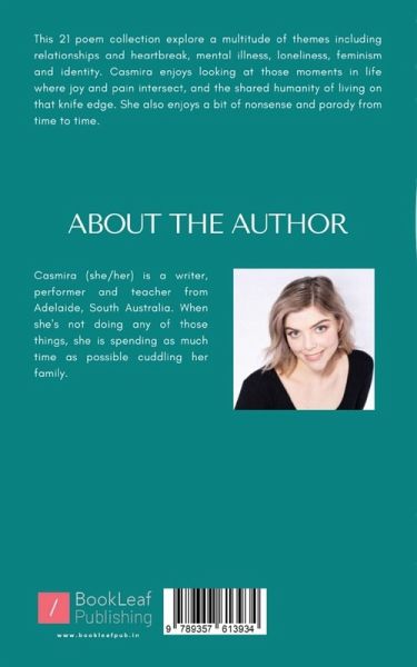 This 21 poem collection explore a multitude of themes including relationships and heartbreak, mental illness, loneliness, feminism and identity. Casmira enjoys looking at those moments in life where joy and pain intersect, and the shared humanity of living on that knife edge. She also enjoys a bit of nonsense and parody from time to time.