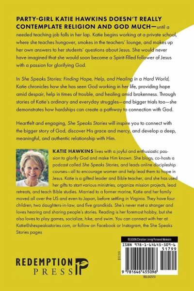 Party-girl Katie Hawkins doesn't really contemplate religion and God much-until a needed teaching job falls in her lap. Katie begins working at a private school, where she teaches hungover, smokes in the teachers' lounge, and makes up her own answers to her students' questions about Jesus. She would never have imagined that she would soon become a Spirit-filled follower of Jesus with a passion for glorifying God. In She Speaks Stories: Finding Hope, Help, and Healing in a Hard World, Katie chronicles how she has seen God working in her life, providing hope amid despair, help in times of trouble, and healing amid brokenness. Through stories of Katie's ordinary and everyday struggles-and bigger trials too-she demonstrates how hardships can create a pathway to connection with God. Heartfelt and engaging, She Speaks Stories will inspire you to connect with the bigger story of God, discover His grace and mercy, and develop a deep, meaningful, and authentic relationship with Him.