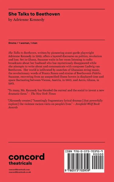 She Talks to Beethoven, written by pioneering avant-garde playwright Adrienne Kennedy in 1989, offers a layered discourse on politics, revolution and loss. Set in Ghana, Suzanne waits in her room listening to radio broadcasts about her husband who has mysteriously disappeared while she attempts to write about and communicate with composer Ludwig van Beethoven. Her world is infiltrated by snatches of Ghanaian string music, the revolutionary words of Frantz Fanon and strains of Beethoven's