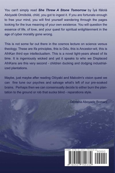 "You can't simply read "She Threw A Stone Tomorrow," child, you got to ingest it. If you are fortunate enough to free your mind, you will find yourself ... looking for the true meaning of your own existence. You will question the essence of life, of love, and your quest for spiritual enlightenment in the age of cyber morality gone wrong. This is not some far out there in the cosmos lecture on science versus theology. These are Ifa principles, this is Odu, this is Ancestor-wit, this is AfriKan third eye intellectualism. This is a novel light-years ahead of its time. It is ingeniously wicked and yet it speaks to who we Displaced AfriKans are this very second-children ducking and dodging industrialized plantations. Maybe, just maybe after reading Olóyabí and Malcolm's vision quest we can fine tune our psyches and salvage what's left of our pre-soaked brains and perhaps then we can consensually decide to either burn the plantation to the ground or ..." - Olorisha Aboyade Bomani