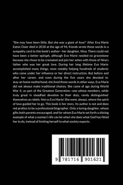 "She may have been little. But she was a giant of love!" After Eva Marie Eaton Osier died in 2018 at the age of 94, friends wrote these words in a sympathy card to this book's author-her daughter, Nina. There could not have been a better epitaph, although Eva Marie needed no gravestone because she chose to be cremated and join her ashes with those of Nina's father who was her great love. During her long lifetime Eva Marie accomplished many things, most notably helping hundreds of students who came under her influence or her direct instruction. But before and after her career, and even during the five years she devoted to stay-at-home motherhood, she lived those words in other ways. Eva Marie did not always make traditional choices. She came of age during World War II, as part of the Greatest Generation-one whose members, while truly great in steadfast devotion to their duty, rarely distinguished themselves as rebels. Not so Eva Marie! She went, always, where the spirit of love guided her to go. This book is her story. Its author is not and does not profess to be a professional biographer. Only a loving daughter, whose gifts both parents encouraged; and for whom Eva Marie set forth a shining example of what a woman's life can be when she does what God has fitted her to do, instead of limiting herself to what society expects.