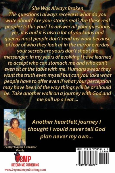 She Was Always Broken The questions I always receive is what do you write about? Are your stories real? Are these real people? Is this you? To answer all your questions yes, it is and it is also a lot of you kings and queens most people don't read my work because of fear of who they look at in the mirror everyday your secrets are yours don't shoot the messenger.In my years of evolving I have learned to accept who can stomach me and who can't even sit at the table with me. Humans swear they want the truth even myself but can you take what people have to offer even if what your perception may have been of the way things will be or should be. Take another walk on a journey with God and me pull up a seat ..