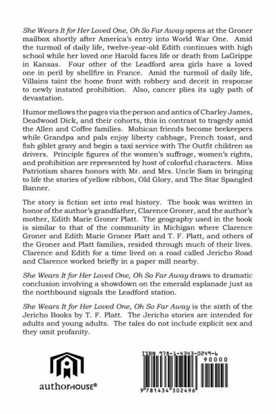 She Wears It for Her Loved One, Oh So Far Away opens at the Groner mailbox shortly after America's entry into World War One. Amid the turmoil of daily life, twelve-year-old Edith continues with high school while her loved one Harold faces life or death from LaGrippe in Kansas. Four other of the Leadford area girls have a loved one in peril by shellfire in France. Amid the turmoil of daily life, Villains taint the home front with robbery and deceit in response to newly instated prohibition. Also, cancer plies its ugly path of devastation. Humor mellows the pages via the person and antics of Charley James, Deadwood Dick, and their cohorts, this in contrast to tragedy amid the Allen and Coffee families. Mohican friends become beekeepers while Grandpa and pals enjoy liberty cabbage, French toast, and fish giblet gravy and begin a taxi service with The Outfit children as drivers. Principle figures of the women's suffrage, women's rights, and prohibition are represented by host of colorful characters. Miss Patriotism shares honors with Mr. and Mrs. Uncle Sam in bringing to life the stories of yellow ribbon, Old Glory, and The Star Spangled Banner. The story is fiction set into real history. The book was written in honor of the author's grandfather, Clarence Groner, and the author's mother, Edith Marie Groner Platt. The geography used in the books is similar to that of the community in Michigan where Clarence Groner and Edith Marie Groner Platt and T. F. Platt, and others of the Groner and Platt families, resided through much of their lives. Clarence and Edith for a time lived on a road called Jericho Road and Clarence worked briefly in a paper mill nearby. She Wears It for Her Loved One, Oh So Far Away draws to dramatic conclusion involving a showdown on the emerald esplanade just as the northbound signals the Leadford station. She Wears It for Her Loved One, Oh So Far Away is the sixth of the Jericho Books by T. F. Platt. The Jericho stories are inten