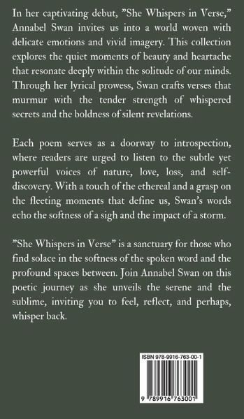 In her captivating debut, "She Whispers in Verse," Annabel Swan invites us into a world woven with delicate emotions and vivid imagery. This collection explores the quiet moments of beauty and heartache that resonate deeply within the solitude of our minds. Through her lyrical prowess, Swan crafts verses that murmur with the tender strength of whispered secrets and the boldness of silent revelations. Each poem serves as a doorway to introspection, where readers are urged to listen to the subtle yet powerful voices of nature, love, loss, and self-discovery. With a touch of the ethereal and a grasp on the fleeting moments that define us, Swan's words echo the softness of a sigh and the impact of a storm. "She Whispers in Verse" is a sanctuary for those who find solace in the softness of the spoken word and the profound spaces between. Join Annabel Swan on this poetic journey as she unveils the serene and the sublime, inviting you to feel, reflect, and perhaps, whisper back. Copyright © 2024 Book Fairy Publishing