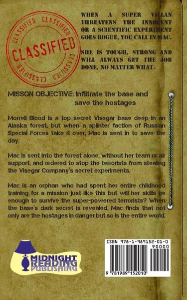 When a Super Villan threatens the innocent or a scientific experiment goes rogue, you call in Mac. She is tough, strong and will always get the job done, no matter what. MISSION OBJECTIVE: Infiltrate the base and save the hostages. Morrel Blood is a top secret Visegar base deep in an Alaska forest but when a splinter faction of Russian Special Forces take it over, Mac is sent in to save the day. Mac is sent into the forest alone, without her team or air support, and orderd to stop the terrorists from steal the Visegar Company's secret experiments. Mac is an orphan who had spent her entire childhood training for a mission just like this but will her skill sbe enough to survive the super-powered terrorists? When the base's dark secret is revealed, Mac finds that not only are the hostages in danger but so is the entire world.