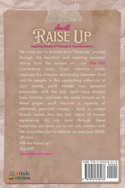 Through this collection of inspiring transformational stories from the women at She Will Conference, you are invited to embark on your own personal "Raise Up" journey. Each narrative vividly captures the intimate relationship between God and His people. In this captivating collection of God stories, you'll witness how these personal encounters with the Holy Spirit have shaped lives, families, and even the world around us. Each contributing author shares candidly from the deep well of their personal pain then shows how Jesus met them with the true, refreshing living water found only through relationship with Him. The names of the contributing authors are: Heather Grissom, Christy Catlin, Kelly Levatino, Liz Catlin, Bev McCann, Laura Anne Smith, Thresa Lawson, Tammy Manning, Jessica Cornelison, Victoria Steelman, and Sara Prather.