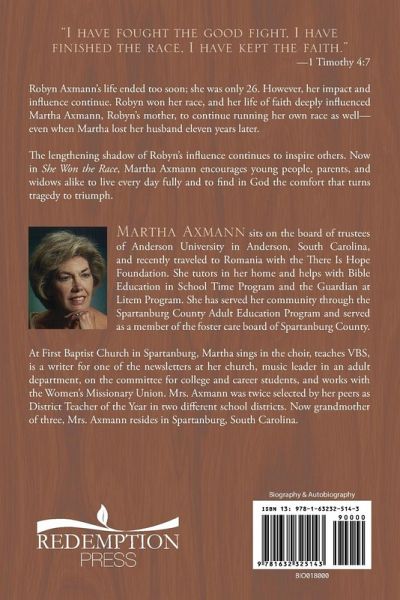 "I have fought the good fight, I have finished the race, I have kept the faith." -1 Timothy 4:7 Robyn Axmann's life ended too soon; she was only 26. However, her impact and influence continue. Robyn won her race, and her life of faith deeply influenced Martha Axmann, Robyn's mother, to continue running her own race as well-even when Martha lost her husband eleven years later. The lengthening shadow of Robyn's influence continues to inspire others. Now in "She Won the Race," Martha Axmann encourages young people, parents, and widows alike to live every day fully and to find in God the comfort that turns tragedy to triumph.